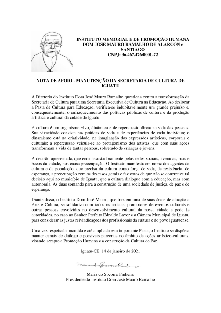 Instituto Dom José Mauro emite nota sobre Secretaria de Cultura de Iguatu