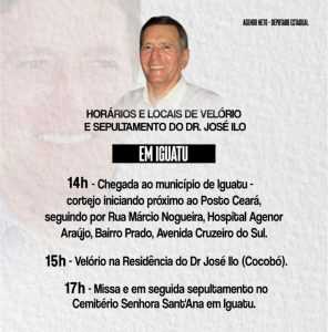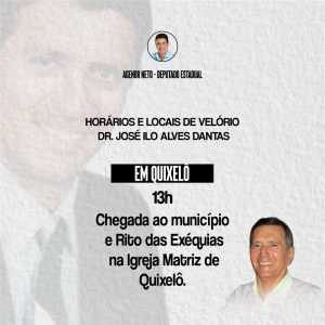Prefeitura de Quixelô decreta luto oficial por 3 dias. O corpo chegará em Quixelô às 13 horas. O velório e a missa de Ezéquias acontecerá na Matriz de Quixelô. Em Iguatu o velório será na residência de dr. José Ilo no Cocobó e o sepultamento será em Iguatu, às 17 horas, no Cemitério Senhora Sant’Ana.