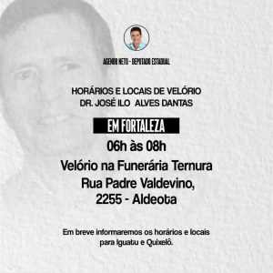 José Ilo Dantas, faleceu em 5 de dezembro de 2023, em Fortaleza, aos 81 anos. Em nota oficial, nas suas redes sociais, o deputado Agenor Neto comunicou, nos primeiros minutos do dia 06 e dezembro, o falecimento de seu pai, o médico e ex-deputado José Ilo Alves Dantas ocorrido dia 05 de dezembro, às 23h:45min. Após 38 dias de internação no Hospital Monte Klinikum, em Fortaleza, lutando contra complicações de saúde, seu pai não resistiu devido a uma infecção hospitalar. Ao longo de 17 anos, enfrentou as adversidades de sua doença, originada por problemas na aorta. O deputado e a família “agradecem sinceramente a todos que ofereceram apoio e orações durante esse período. José Ilo Dantas, lembrado como exemplo de ser humano, pai de família e médico humanitário, deixa um legado que será lembrado para sempre.” Agenor Neto expressou amor eterno a dr. Zé Ilo e agradeceu a todos que compartilharam da jornada de José Ilo Dantas.