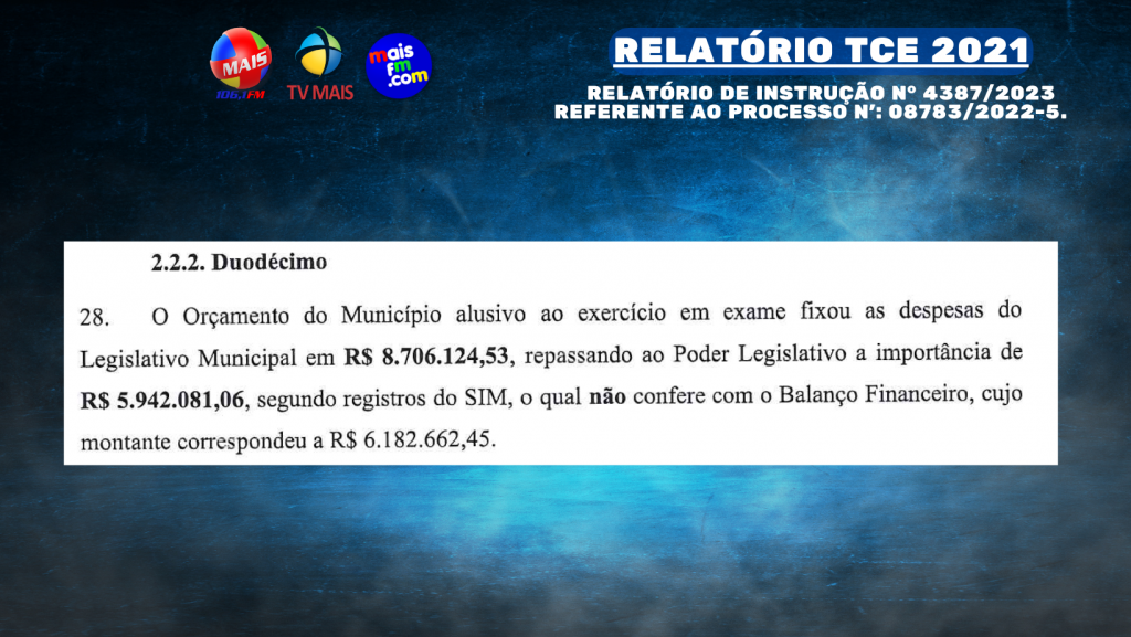 – Divergência entre o montante repassado do Duodécimo informado no SIM (R$ 5.942.081,06) e o divulgado no Balanço Financeiro (R$ 6.182.662,45).