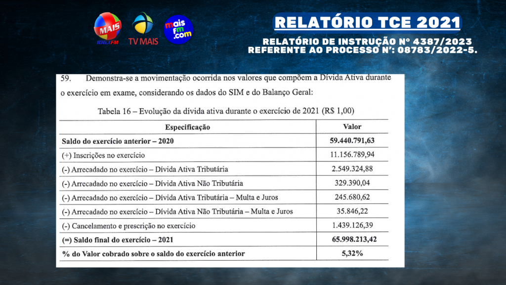 - Dívida Ativa: Houve divergência no saldo da Dívida Ativa do exercício, e o percentual arrecadado foi baixo, indicando falta de cobrança.