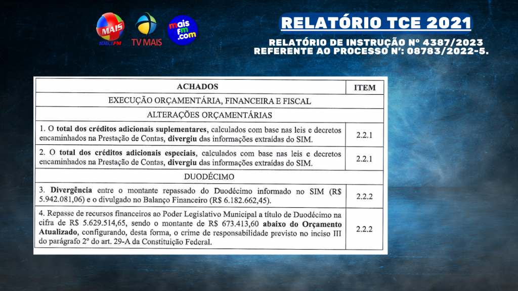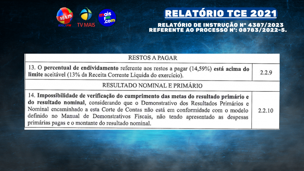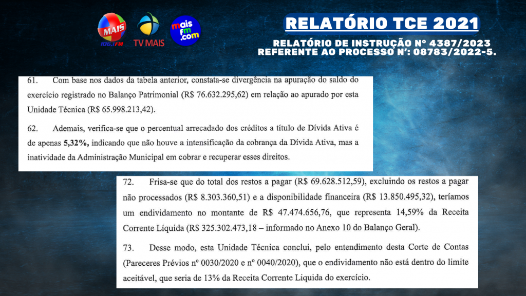 Encaminhado à Câmara Municipal pelo prefeito Ednaldo de Lavor Couras, dentro do prazo estabelecido pela legislação, o relatório destaca diversos problemas, incluindo Créditos Adicionais, Duodécimo, Limite Constitucional de Gastos com Educação e Saúde, Despesas com Pessoal, Dívida Ativa, Previdência, Restos a Pagar, Resultado Nominal e Primário, Dívida Flutuante relacionada com os Restos a Pagar, e Resultado Primário e Nominal.