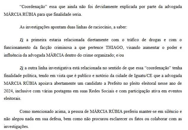 A Polícia Civil de Iguatu identificou indícios contundentes de crimes eleitorais envolvendo a advogada Márcia Rúbia Batista Teixeira e o traficante Thiago Oliveira Valentim, conhecido como Thiago Fumaça, no âmbito da campanha de Roberto Costa Filho à prefeitura de Iguatu. As investigações, que vinham sendo realizadas há alguns meses, indicam uma possível compra de votos e financiamento ilícito da campanha por meio de ligações com o crime organizado.