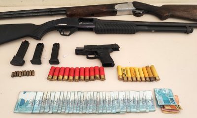 Dentre os suspeitos, dois usavam farda da Força Nacional de Segurança Pública. Eles estavam com duas pistolas calibre 380 e um simulacro de fuzil.