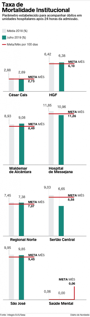 No HGF, por exemplo, a meta é de 6,1%: mas em julho deste ano, a mortalidade institucional foi de 6,4%, mesma quantidade média do ano passado. Em 2019, o HGF não conseguiu se adequar à meta em mês algum. No Waldemar de Alcântara, a meta é que haja, no máximo, 8,5% de óbitos: no mês passado, contudo, o índice foi de 9%, e o hospital também excedeu o percentual em maio, com 10,4%. Em 2018, a taxa média de mortalidade institucional na unidade foi de 8,9%.